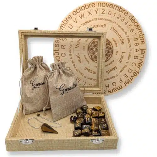Coffret de divination en Oeil de tigre – Pendule et runes