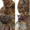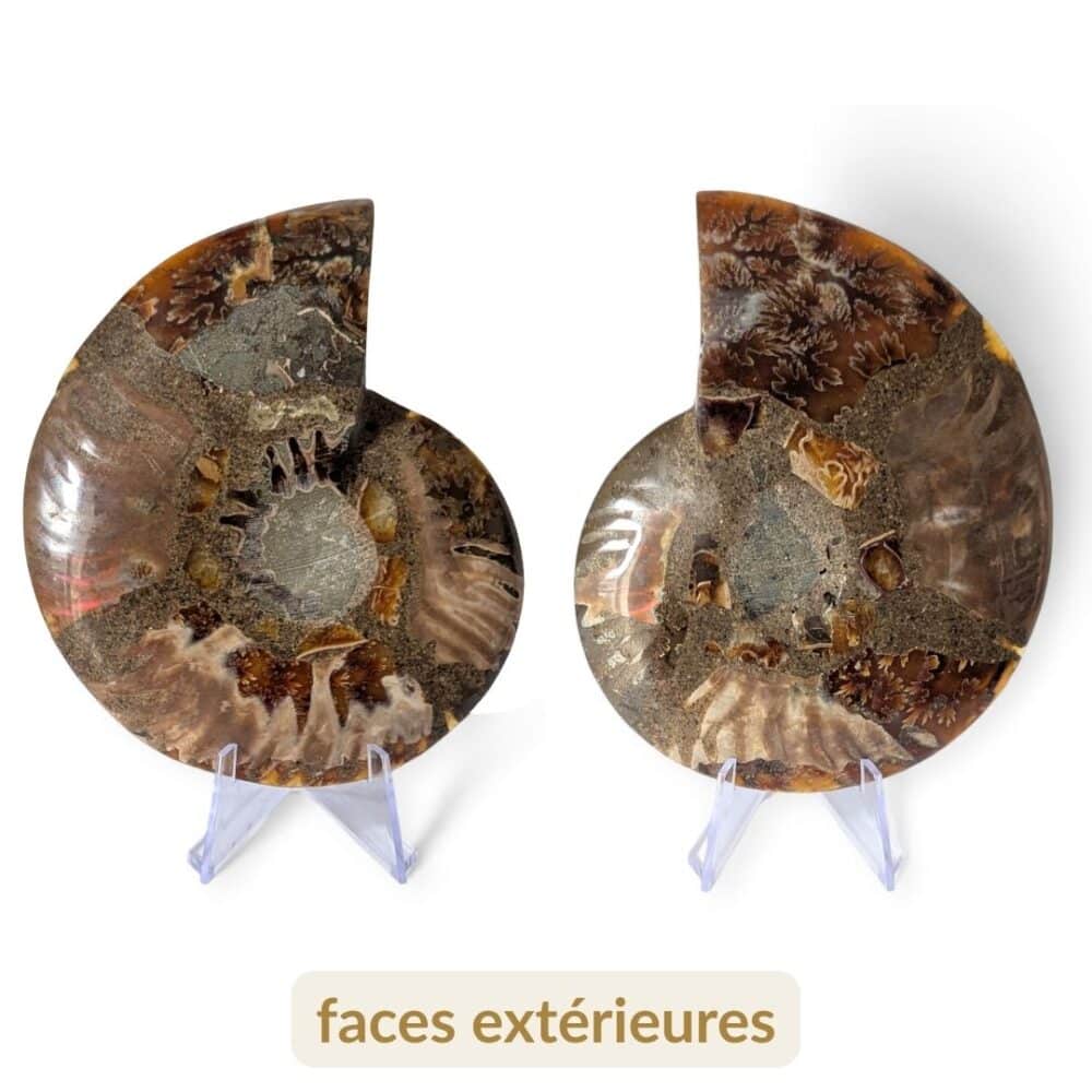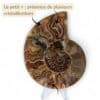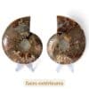 Présentée en paire (coquille scindée en 2), vous pouvez ainsi admirer la beauté de l’intérieur de sa coquille en forme de spirale, qui évoque la forme des cornes d’un bélier. L’intérieur contient des “loges” séparées par des cloisons. Ces “chambres” jouaient un rôle essentiel : en les remplissant alternativement d’eau ou de gaz, l’Ammonite pouvait se déplacer et ajuster sa profondeur dans l’océan, à la manière d’un sous-marin naturel.