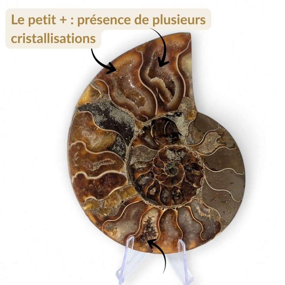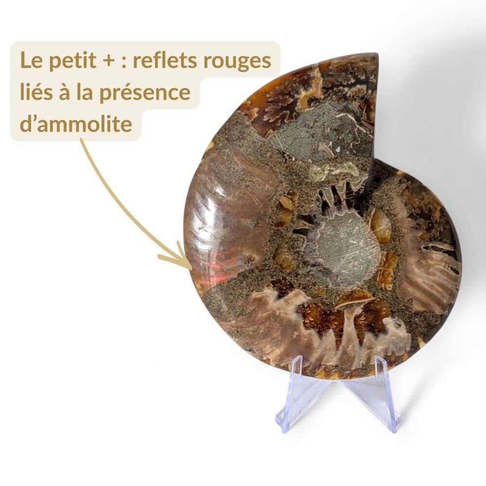 Le petit + qui fait la différence : l’intérieur des coquilles présente des cavités cristallisées et l’extérieur possède à certains endroits des reflets rouges liés à la présence d’Ammolite. Alors si vous êtes à la recherche d’un fossile surprenant, cette coquille d’Ammonite complétera à merveille votre collection !