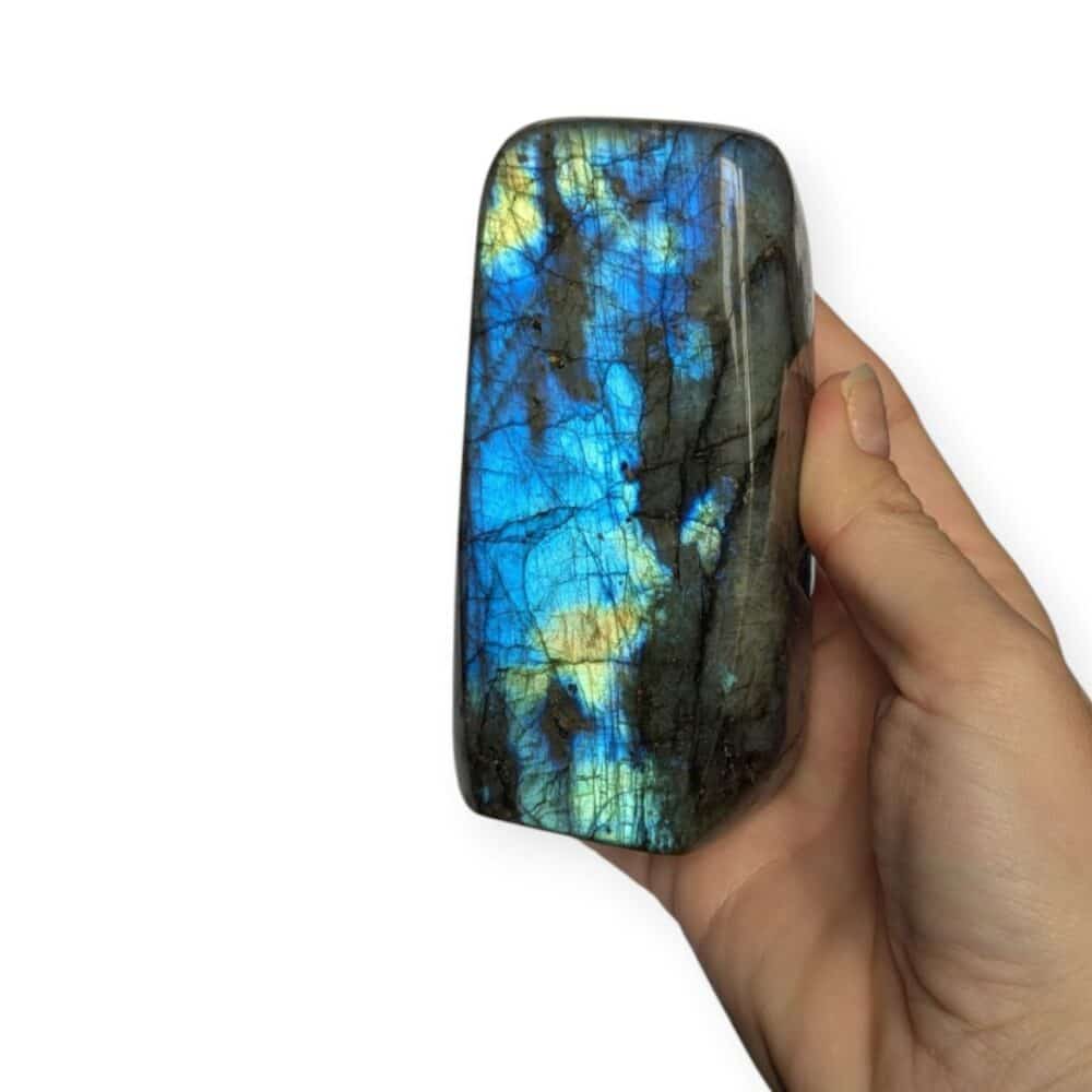 Cette Labradorite est fascinante par ses reflets bleus et dorés.