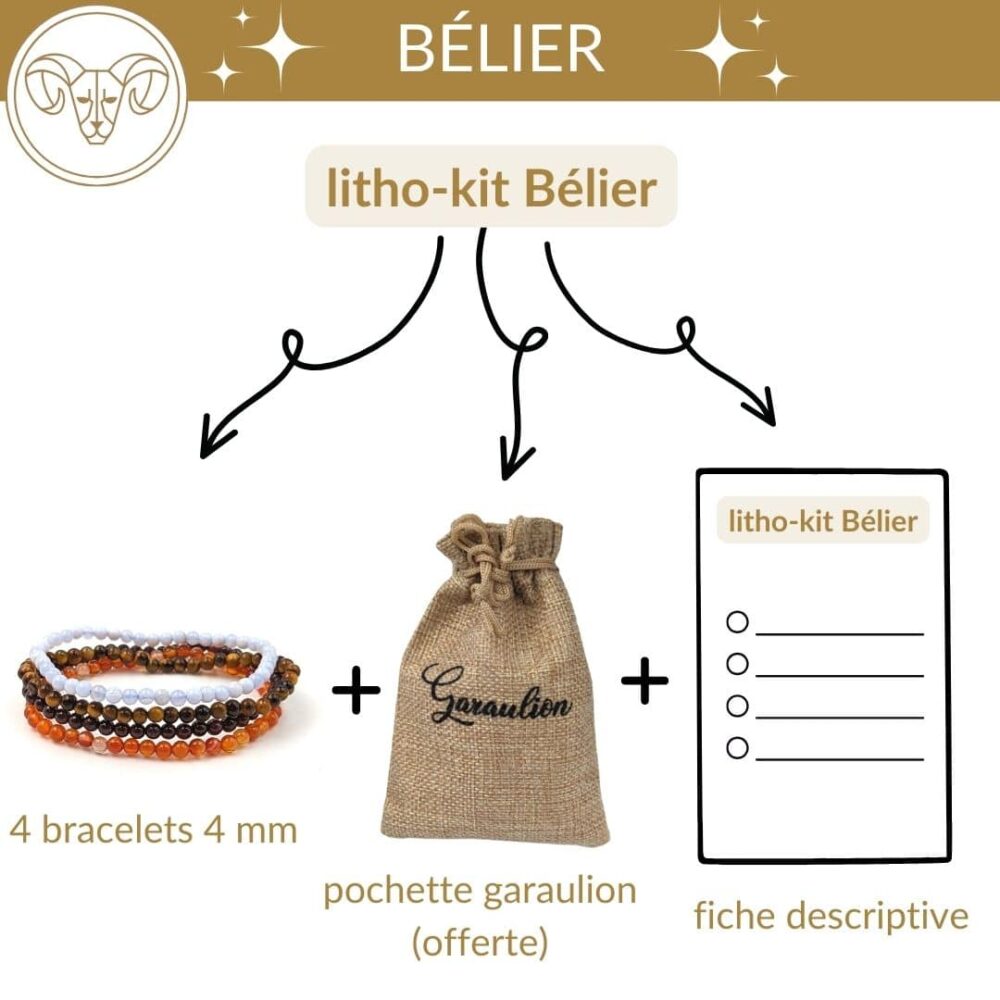 OFFERT : pochette de rangement pour vos 4 bracelets + fiche descriptive du litho-kit “Bélier”.