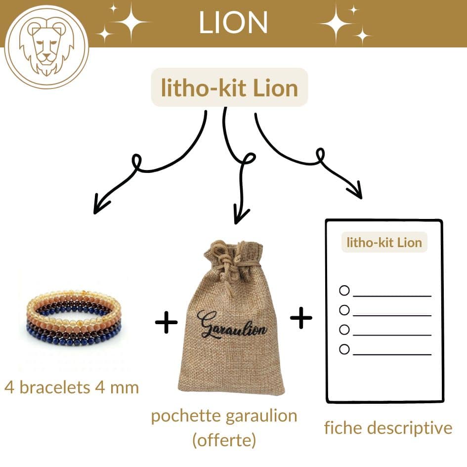 OFFERT : pochette de rangement pour vos 4 bracelets + fiche descriptive du litho-kit “Lion”.