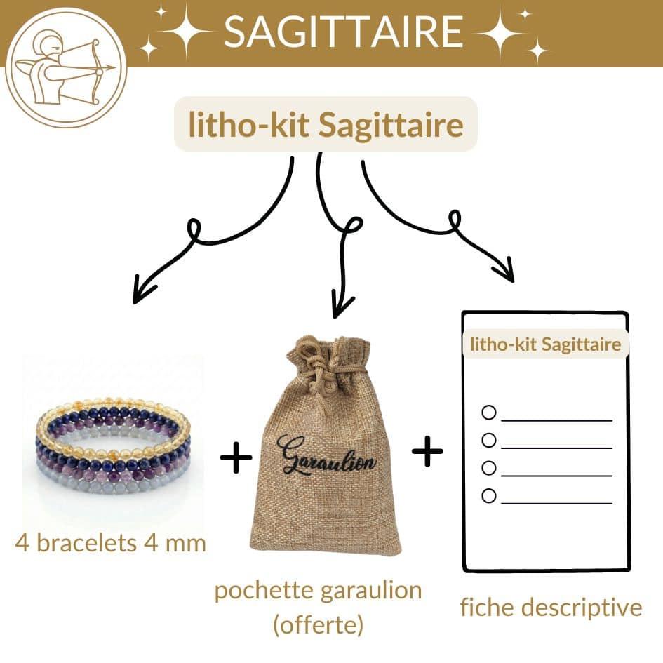 OFFERT : pochette de rangement pour vos 4 bracelets + fiche descriptive du litho-kit “Sagittaire”.