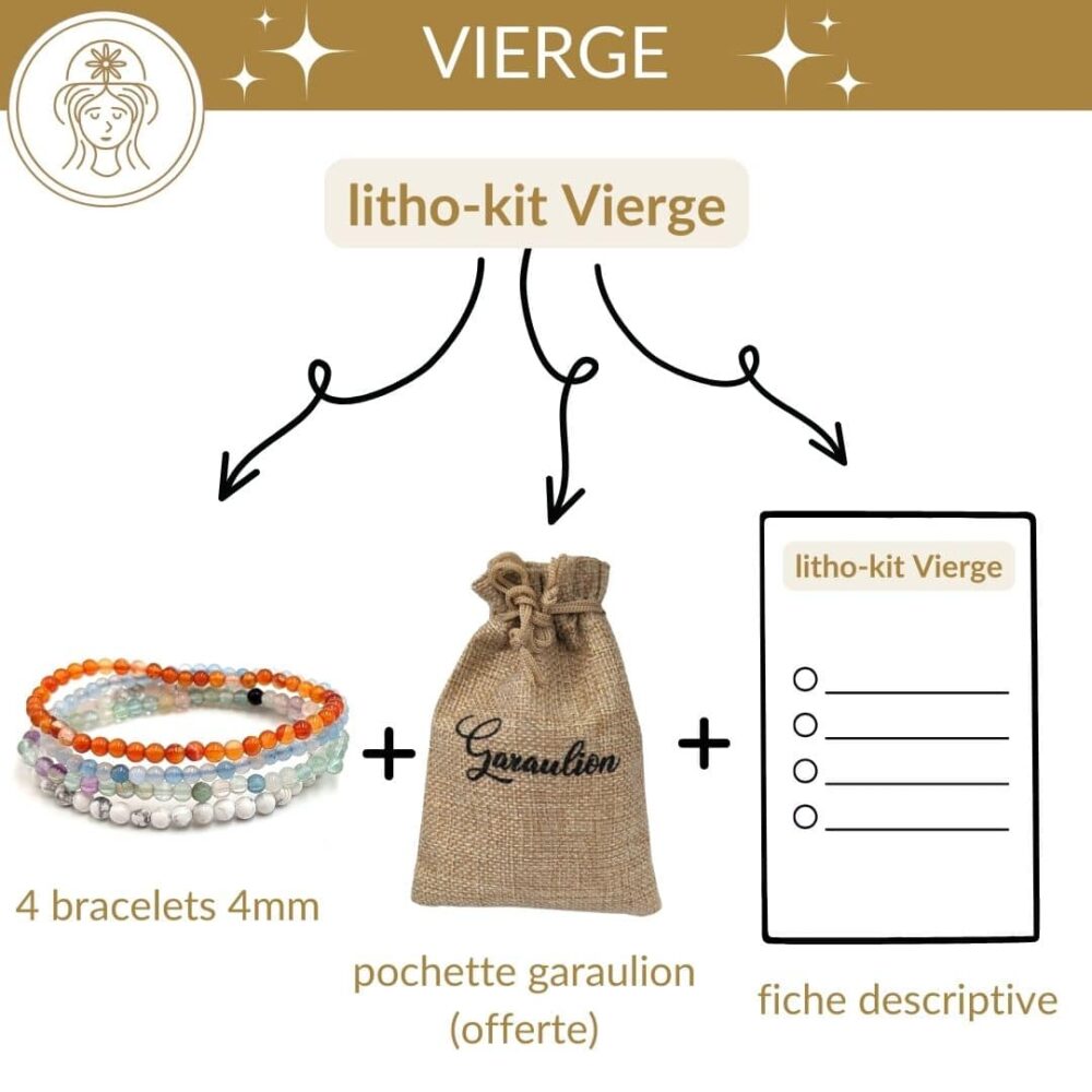 OFFERT : pochette de rangement pour vos 4 bracelets + fiche descriptive du litho-kit “Vierge”.