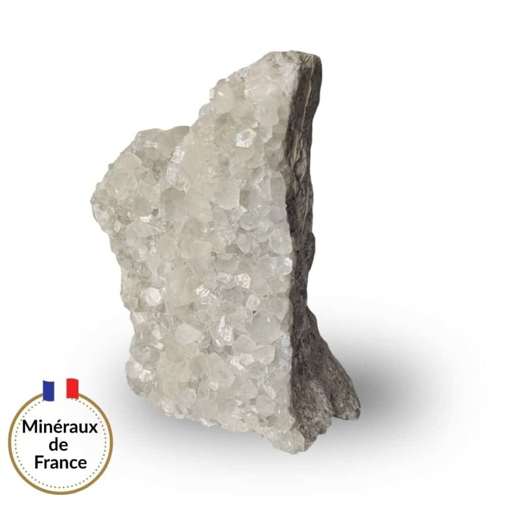 Comment s’est formée cette calcite ? Au fil du temps, de l’eau riche en calcium s’est infiltrée dans la roche située dans des cavités souterraines (grottes, fissures rocheuses)… Puis, lentement, les cristaux se sont formés, un à un, créant cette structure cristalline appelée druse.