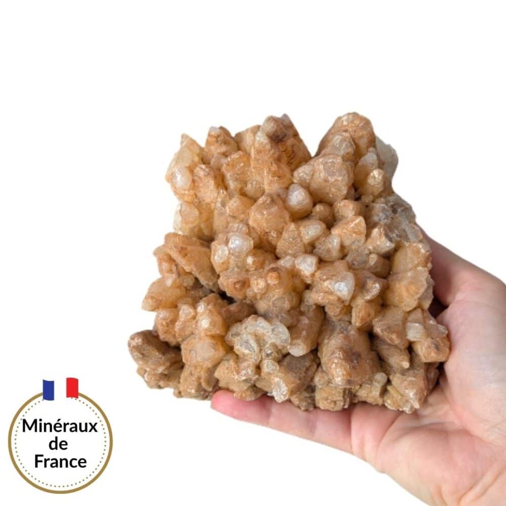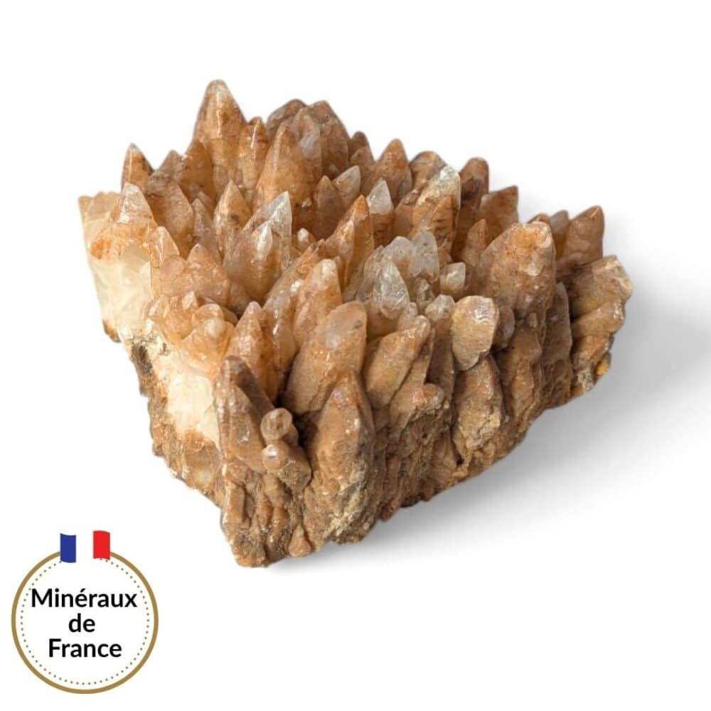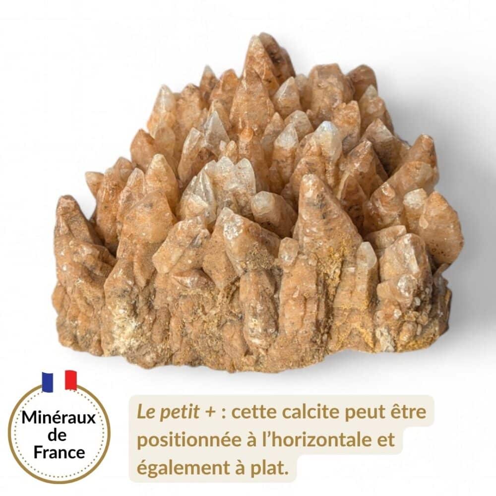 Cette Calcite de Dordogne présente une cristallisation dite “dents de chien”, reconnaissable à ses cristaux pointus appelés scalénoèdres. Une forme typique en minéralogie, qui apparaît lorsque la calcite se développe lentement dans des conditions favorables, souvent en milieu souterrain.