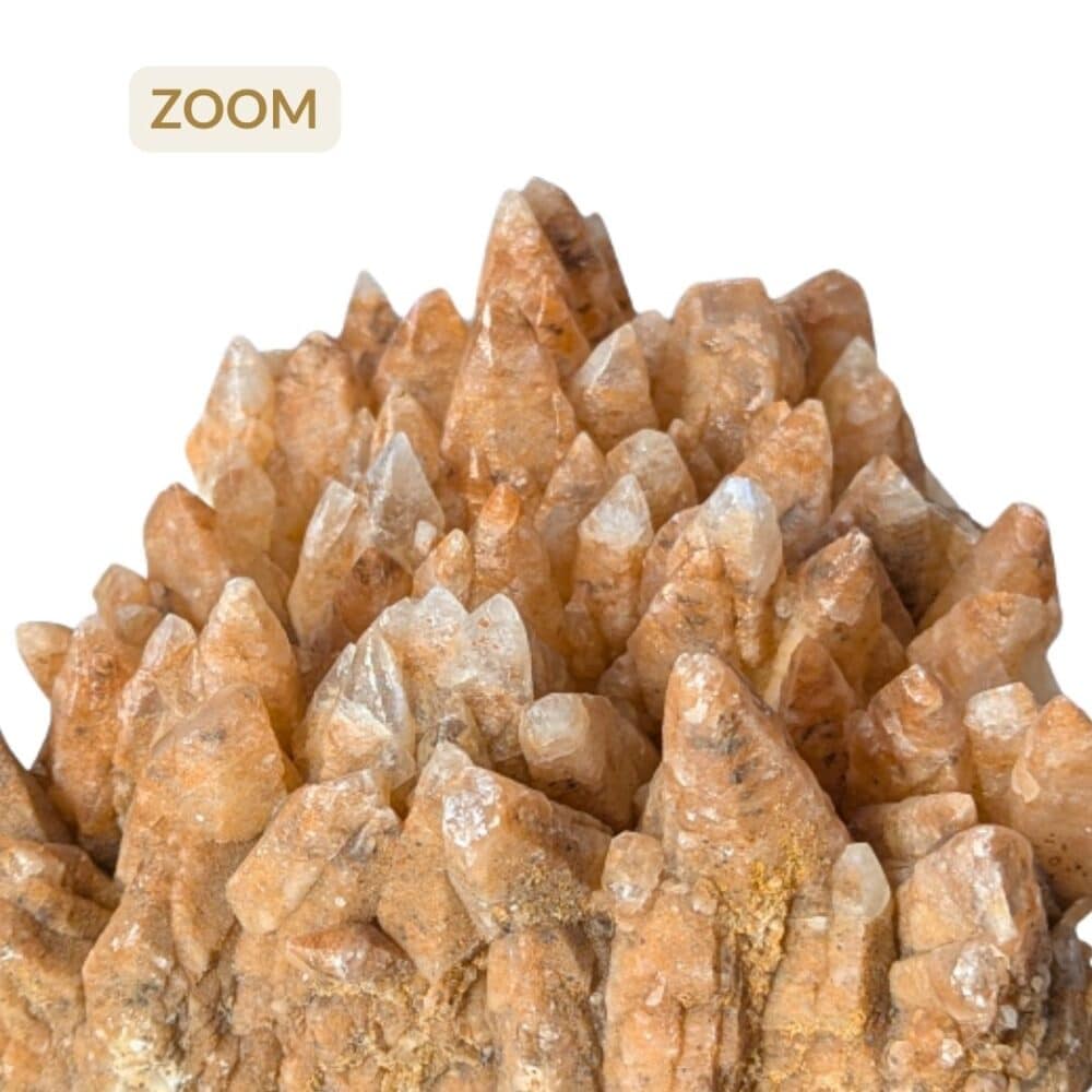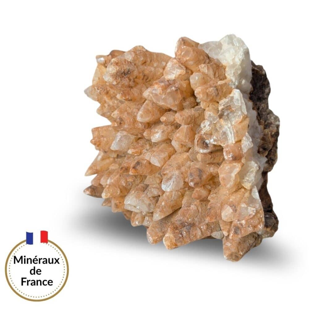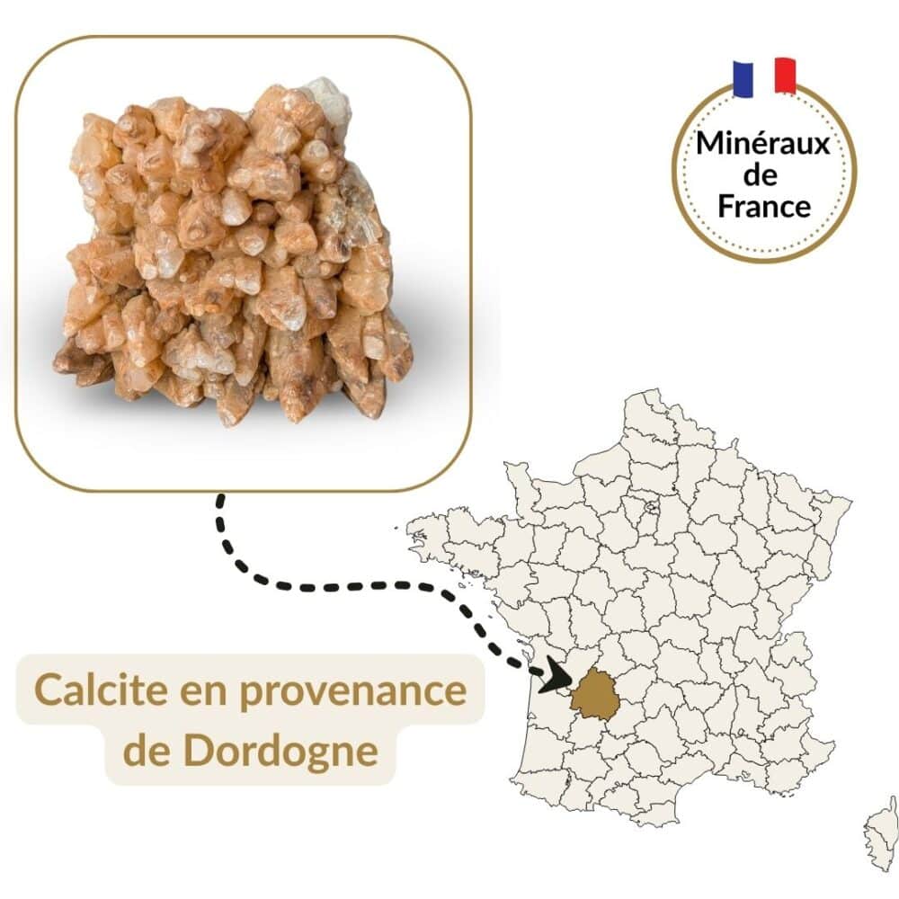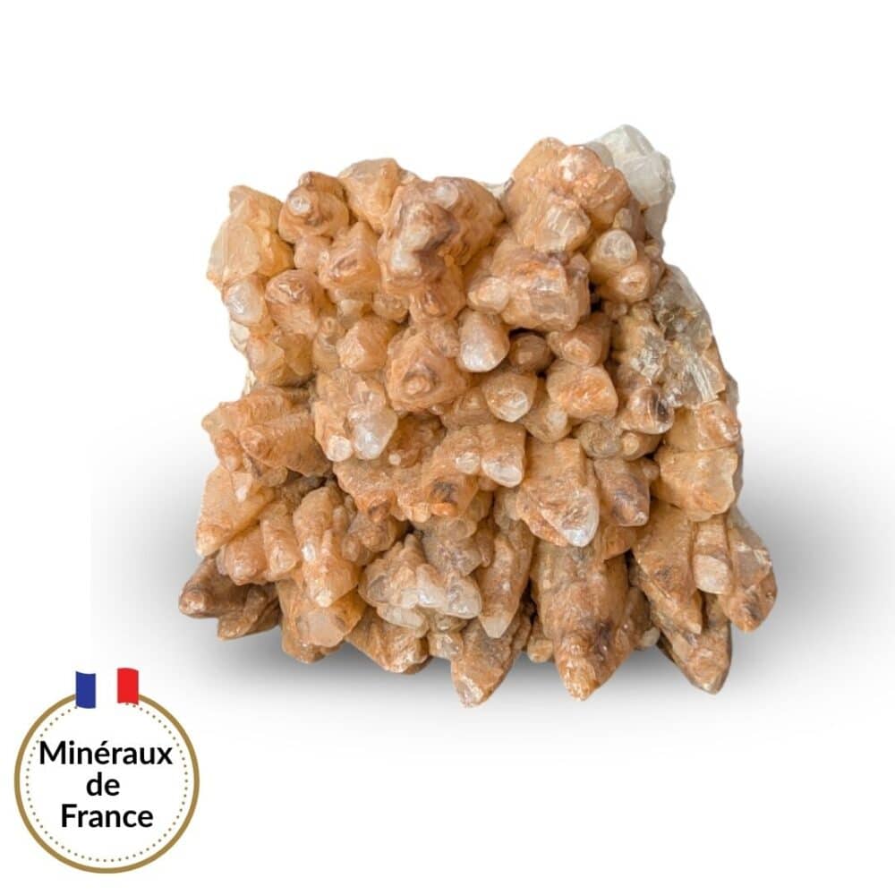 Cette Calcite de Dordogne présente une cristallisation dite “dents de chien”, reconnaissable à ses cristaux pointus appelés scalénoèdres. Une forme typique en minéralogie, qui apparaît lorsque la calcite se développe lentement dans des conditions favorables, souvent en milieu souterrain.