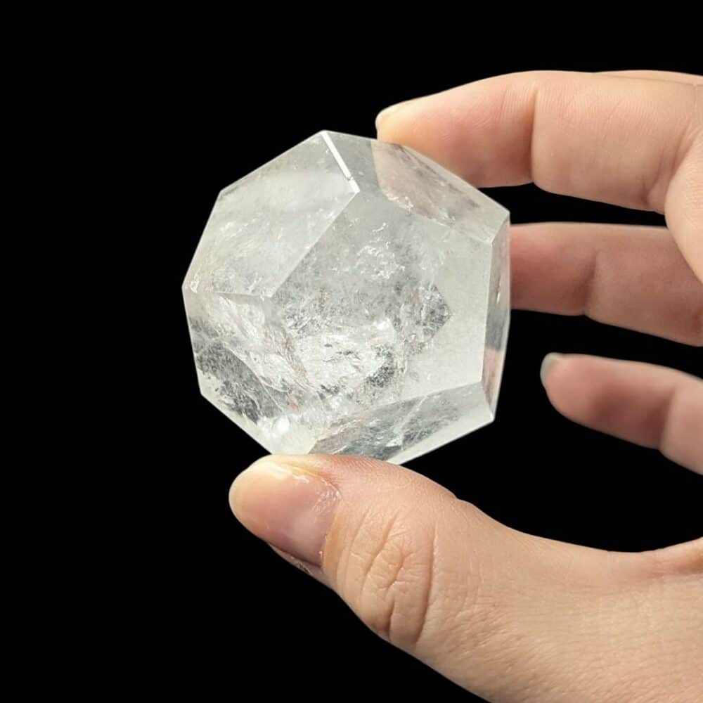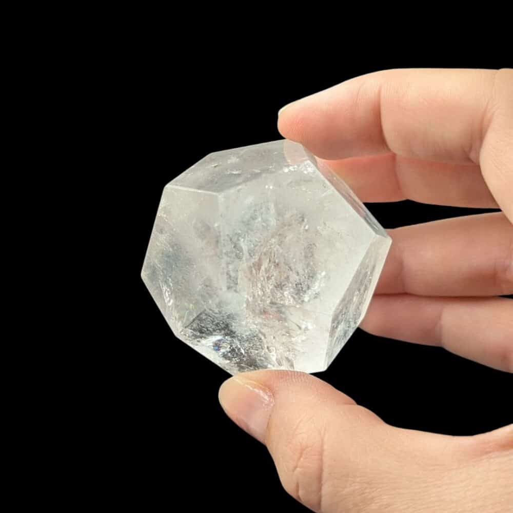 Le dodécaèdre en cristal de roche fait partie des cinq solides de Platon. Il se reconnaît facilement grâce à sa géométrie puissante et équilibrée : 20 sommets, 30 arêtes et 12 faces en pentagones réguliers. Cette forme symbolise l’ordre, l’harmonie et l’organisation subtile de l’univers.