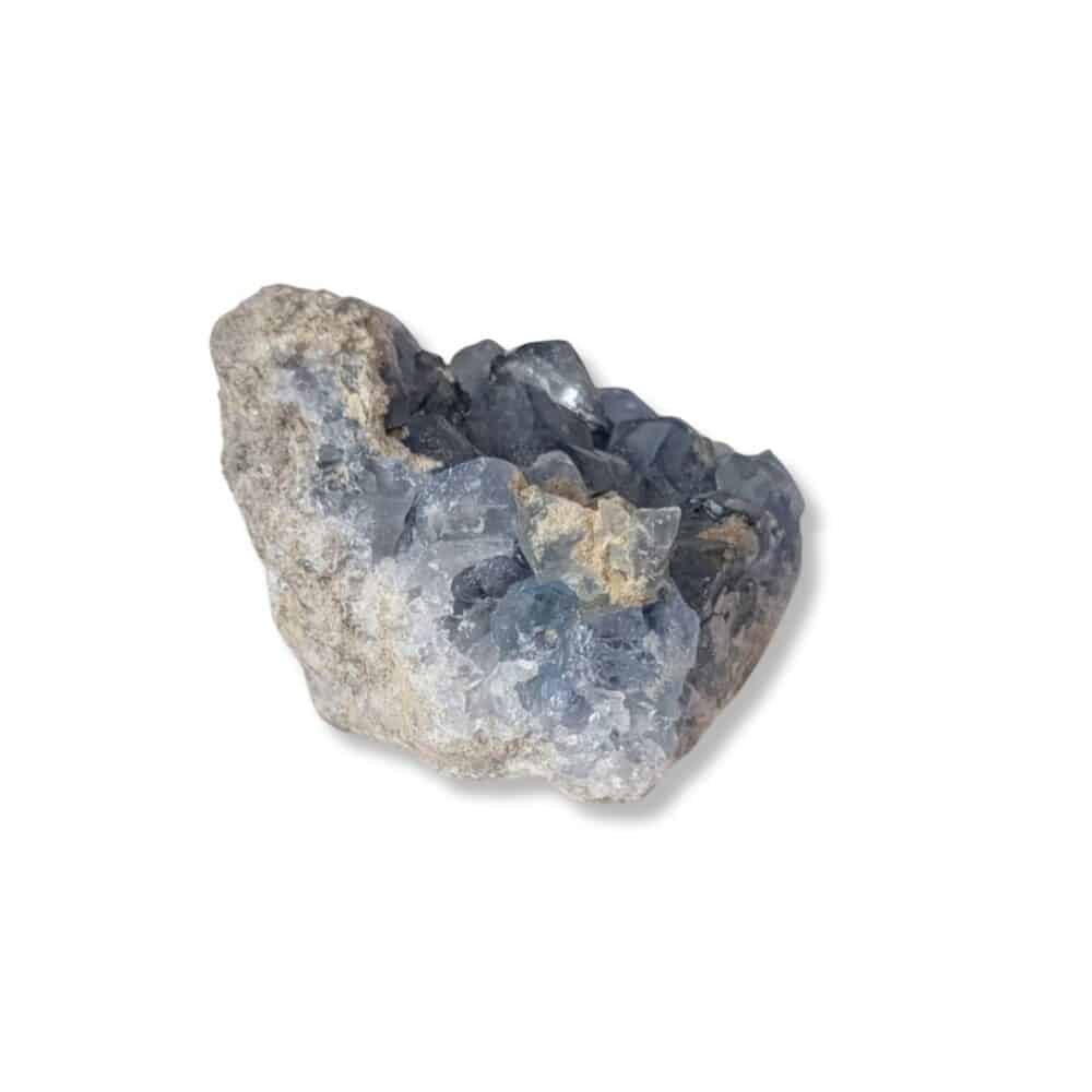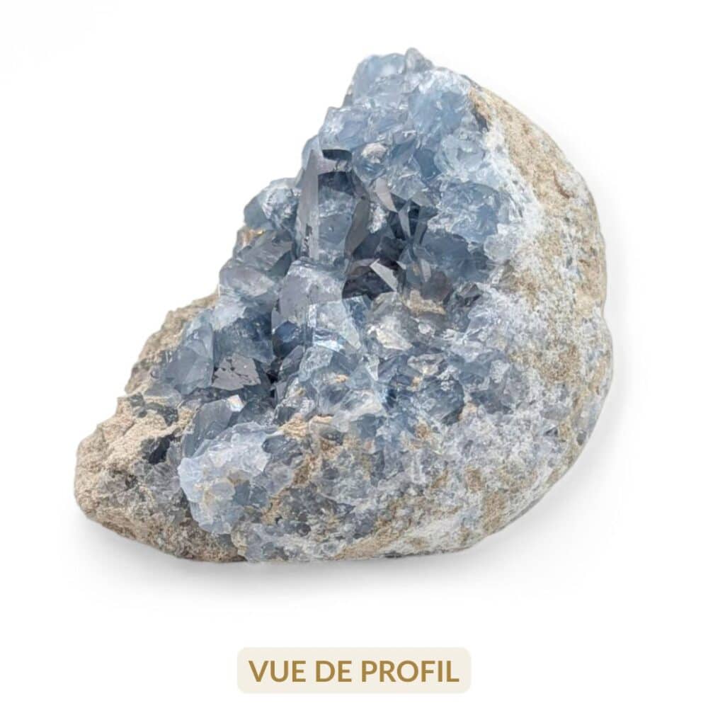 La druse de Célestine est une pierre douce, réputée pour ses vertus apaisantes et rassurantes. Elle diffuse une énergie de sérénité qui aide à calmer le stress et les inquiétudes. Cette pierre aux cristaux bleus a toujours été associée à la spiritualité : son nom latin caelestis signifie “céleste, divin”. Elle favorise les rêves et aide à s’en souvenir, tout en facilitant la connexion à soi, à l’univers et aux énergies cosmiques.