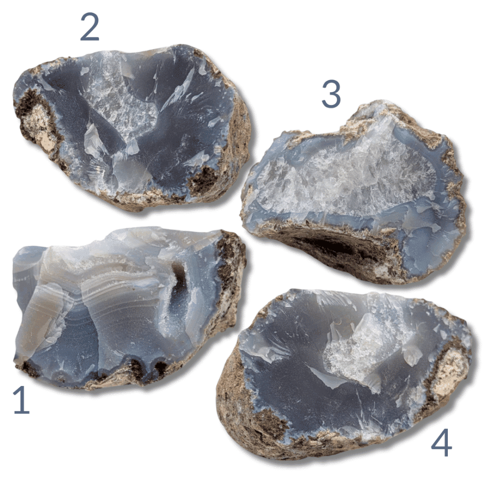 Imaginez une géode d’agate dont l’extérieur rappelle une noix de coco, c’est ainsi qu’est née l’appellation « Coconut ». Coupée en deux, elle révèle un cœur cristallin aux différentes nuances de bleu. Ce sont ces morceaux de géode d’agate Coconut que nous vous invitons à découvrir.