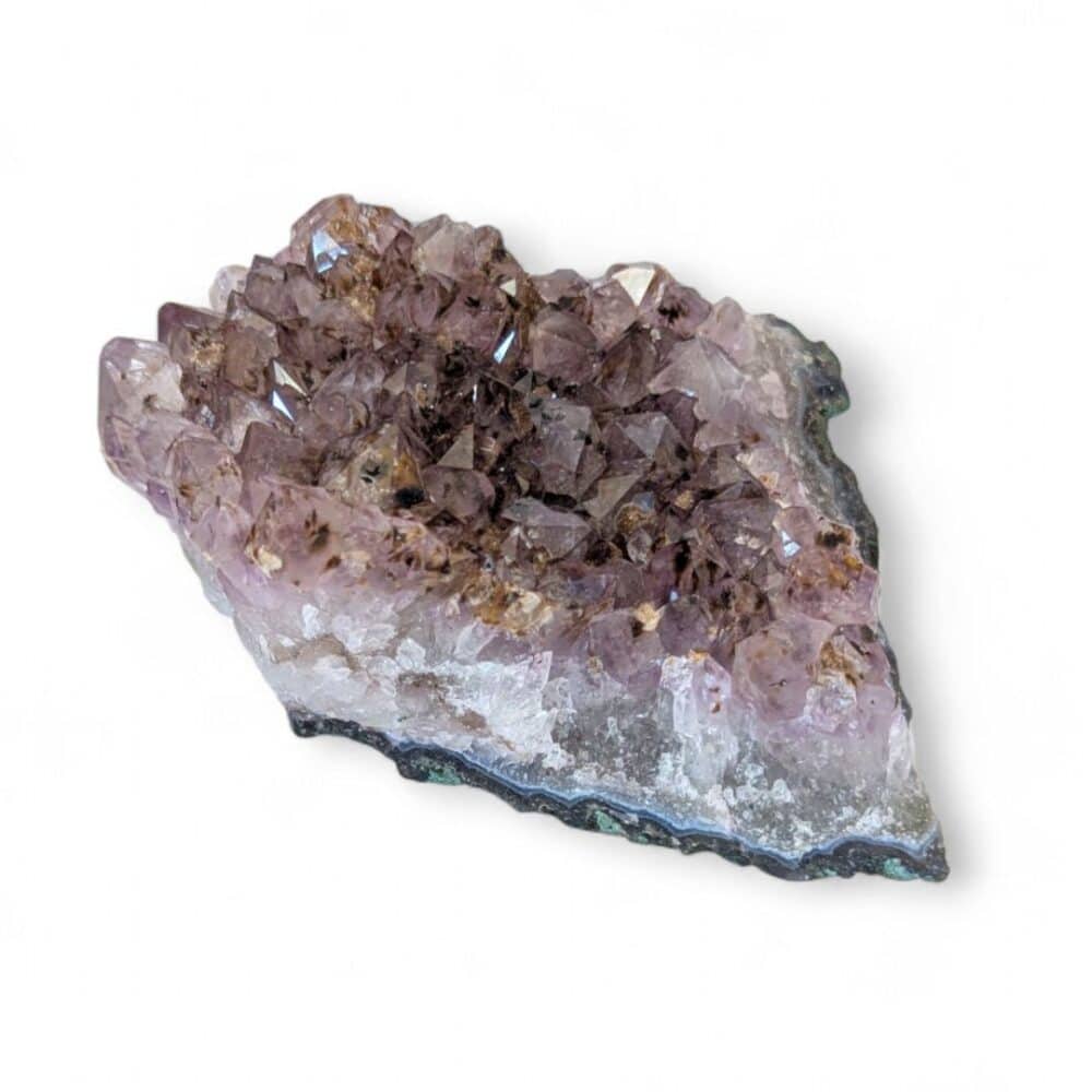 Ces formations minérales contrastent élégamment avec le violet profond de l’améthyste, apportant une dimension mystérieuse et captivante à chaque pièce