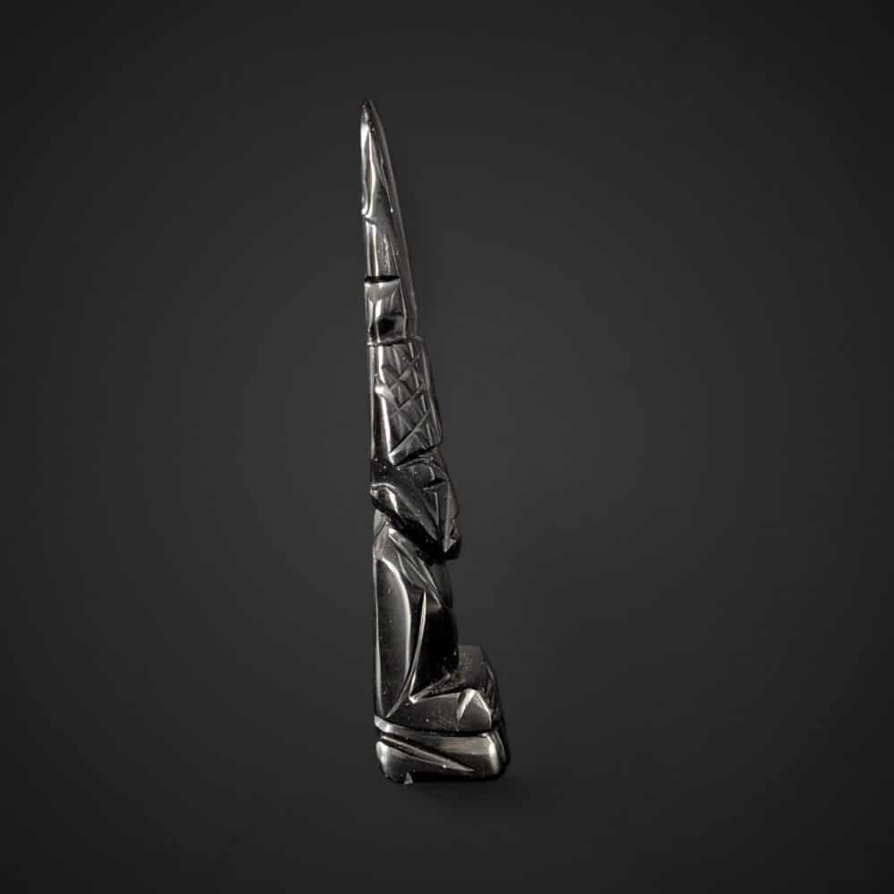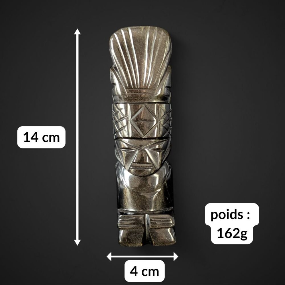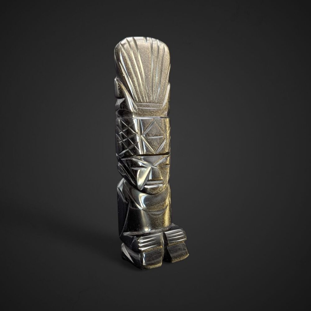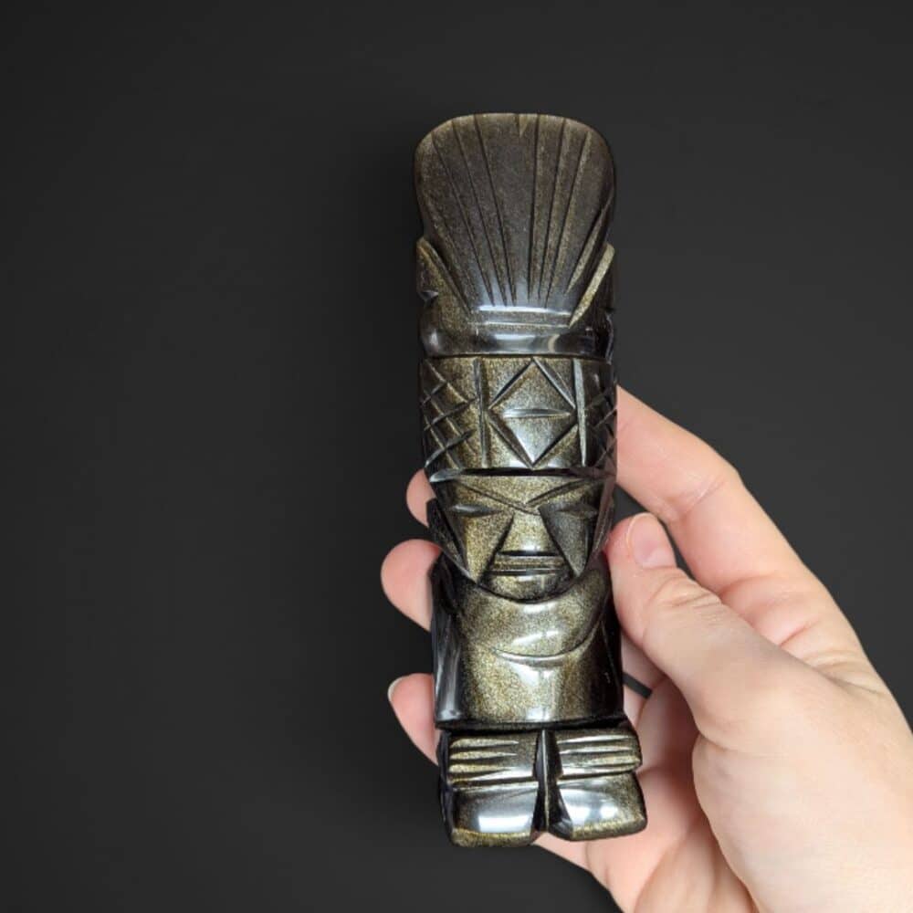 Découvrez ce totem représentant un guerrier aztèque, sculpté dans de l’obsidienne dorée. Cette statuette semble veiller sur vous en silence. Ses reflets changent avec la lumière… comme si elle révélait ce que l’œil ne voit pas toujours. Elle semble porter en elle la mémoire d’un peuple ancien.