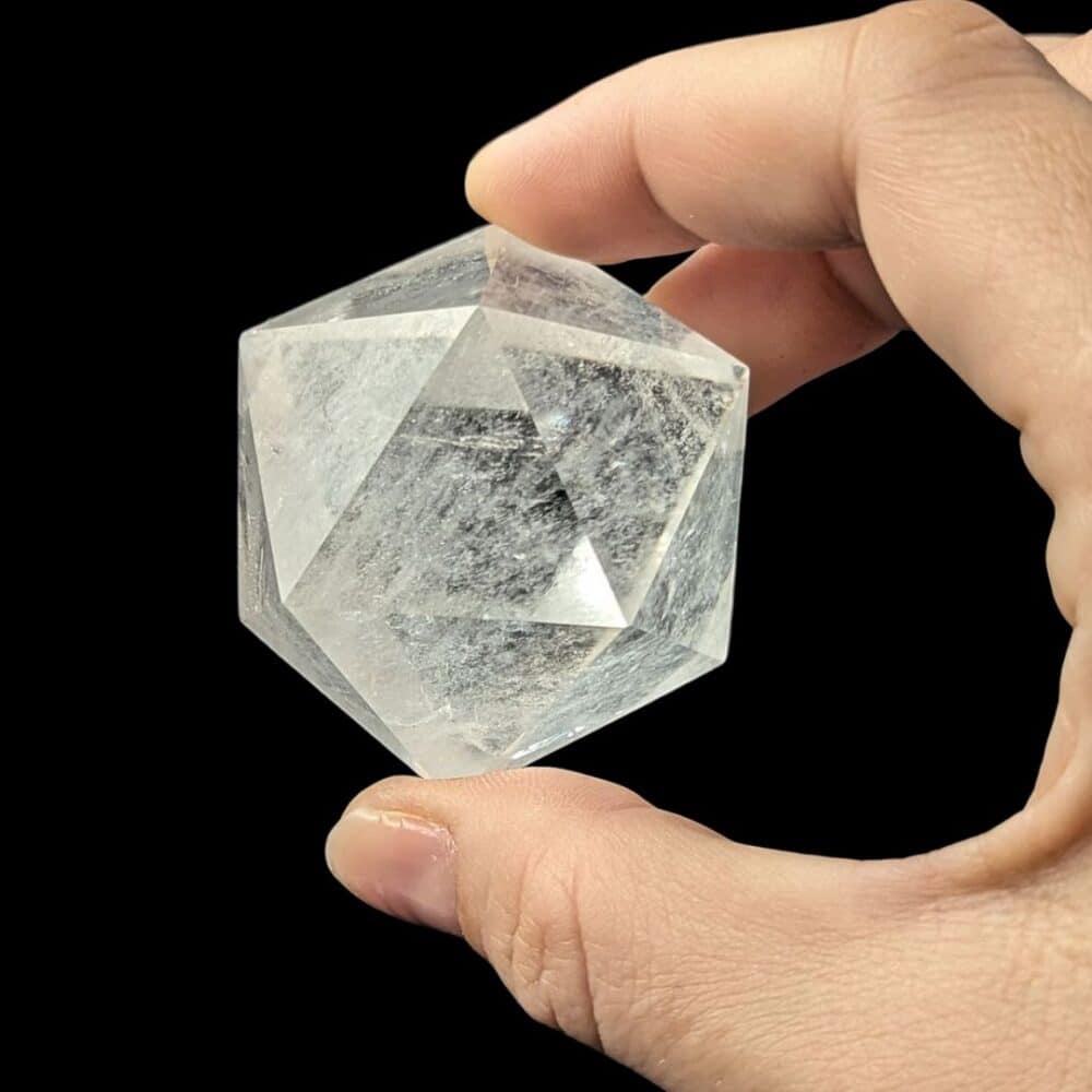 Sa signification spirituelle : la transformation. L’icosaèdre en cristal de roche vous accompagne dans les périodes de changement, d’introspection et de libération émotionnelle.