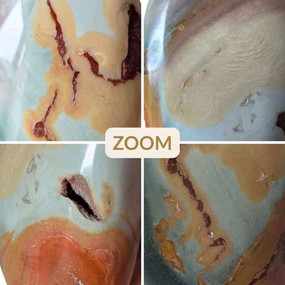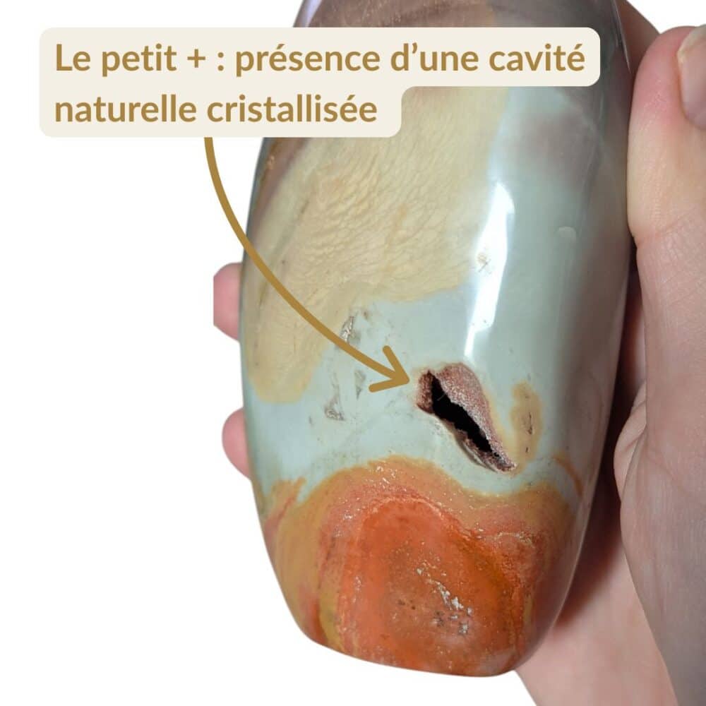 Ce Jaspe Polychrome semble raconter une histoire où la terre, le feu et la douceur se rencontrent dans un mouvement vibrant d’énergie et de chaleur.