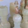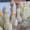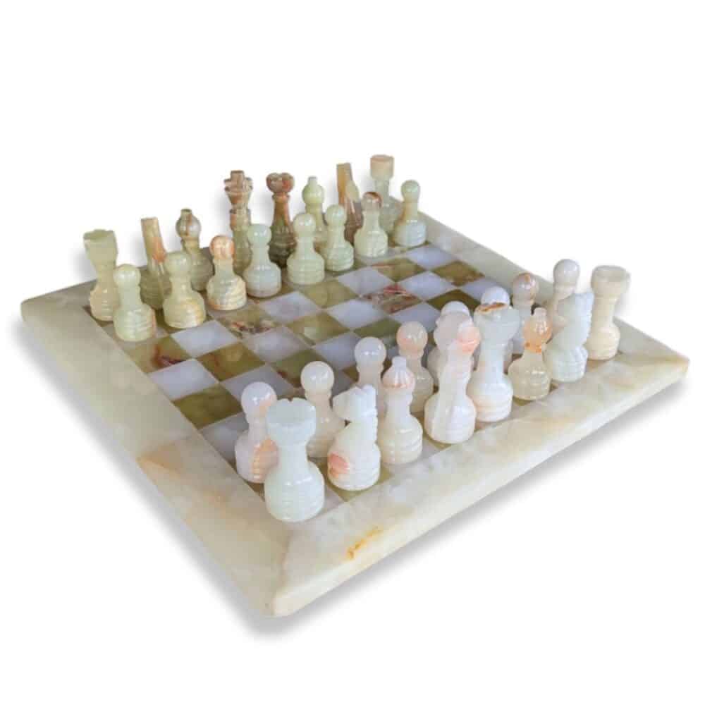 Ce magnifique ensemble de jeu d’échecs en pierre naturelle d’onyx vert pâle et blanc cassé est travaillé tout en finesse. Rois, dames, tours, fous, cavaliers et pions minutieusement sculptés se livrent à de brillantes stratégies et tactiques sur un grand échiquier de 40x40cm où s’alternent les cases en Onyx blanc cassé et celles en Onyx vert.
