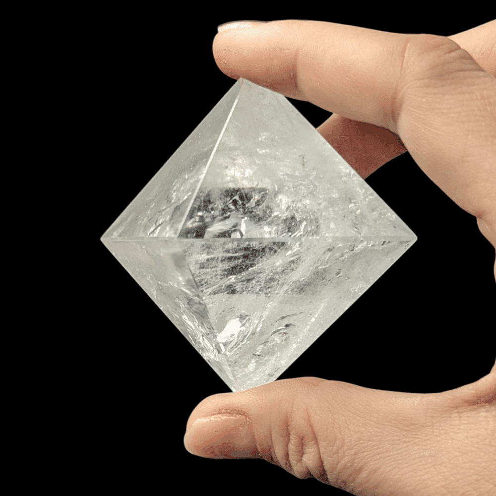 Cet Octaèdre en Cristal de roche de 6,5cm est une forme géométrique sacrée appartenant aux 5 solides de Platon.