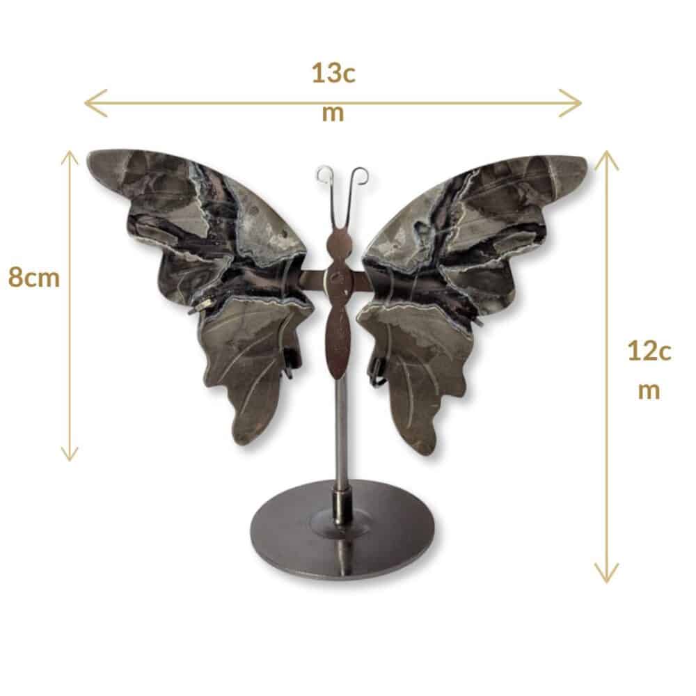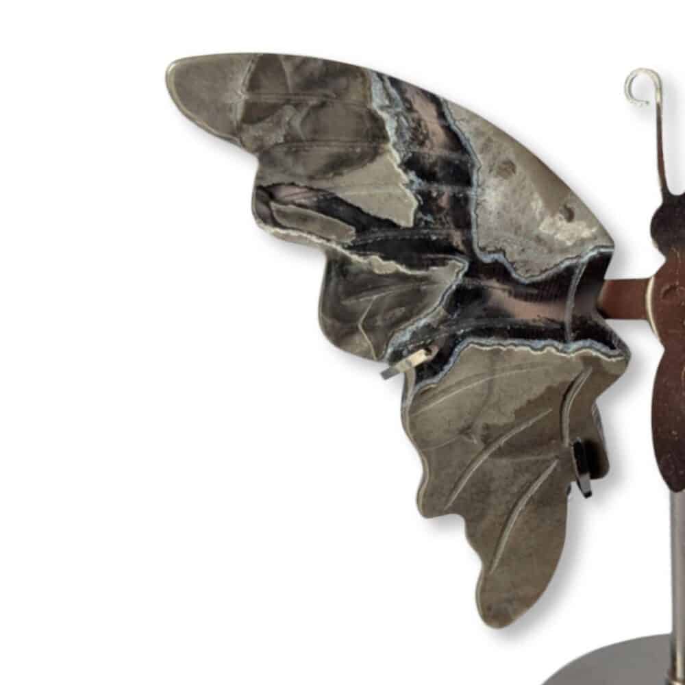 Les 2 ailes en pierres naturelles d’Agate sont soutenues sur le socle métallique en forme de papillon.