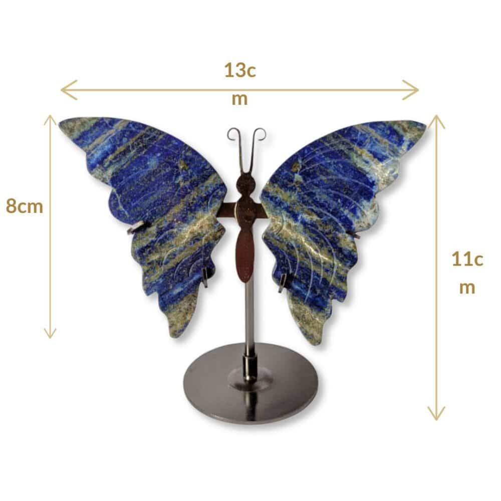 Les 2 ailes en pierres naturelles de Lapis-Lazuli sont soutenues sur le socle métallique en forme de papillon.