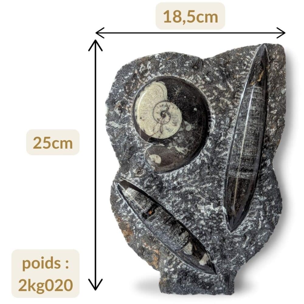 Cette grande plaque fossile réunit deux Orthoceras de belle taille et une Goniatite. L’association des formes droites et de la spirale crée un contraste naturel fort. Avec ses 25 cm, c’est une pièce décorative imposante qui attire immédiatement le regard et la curiosité.