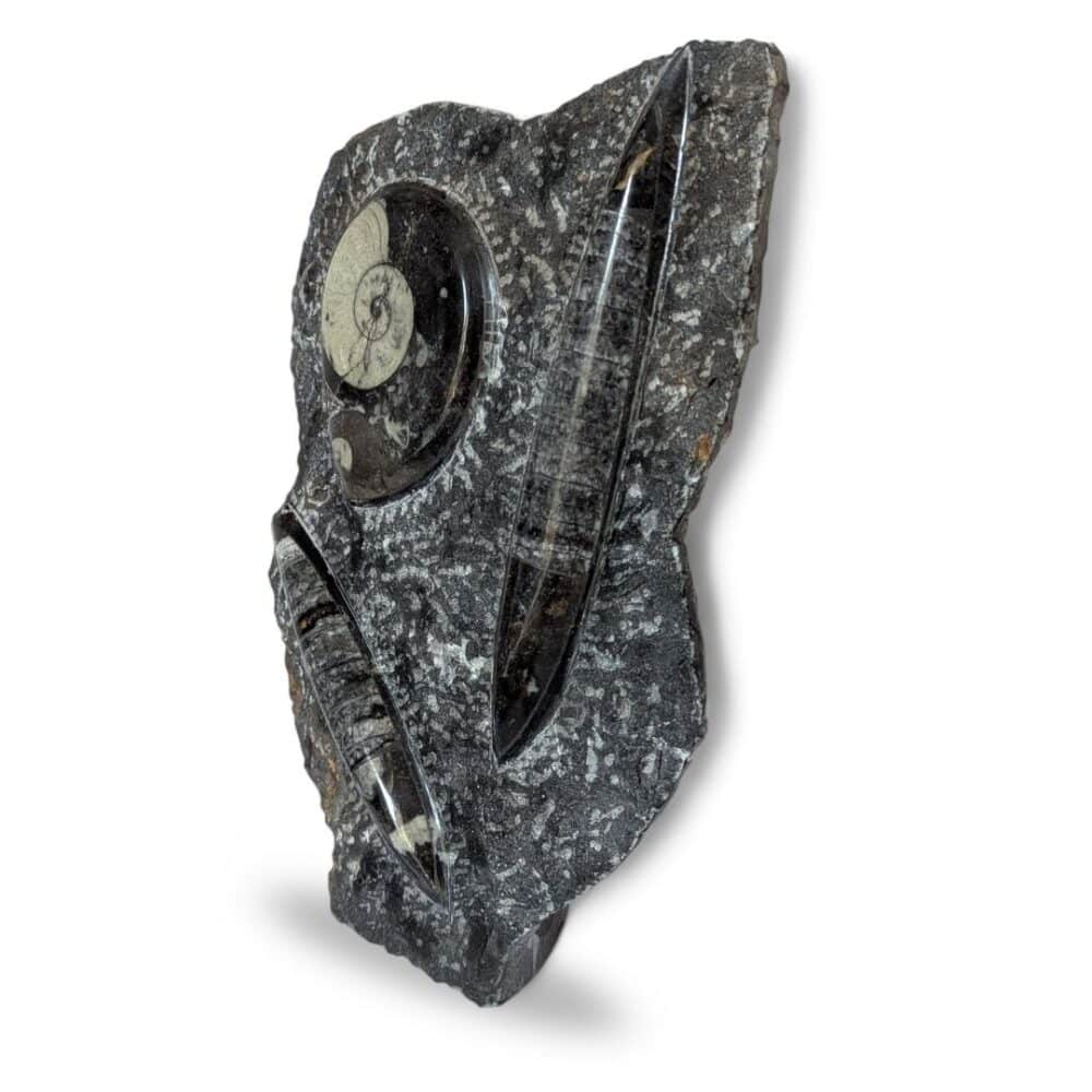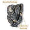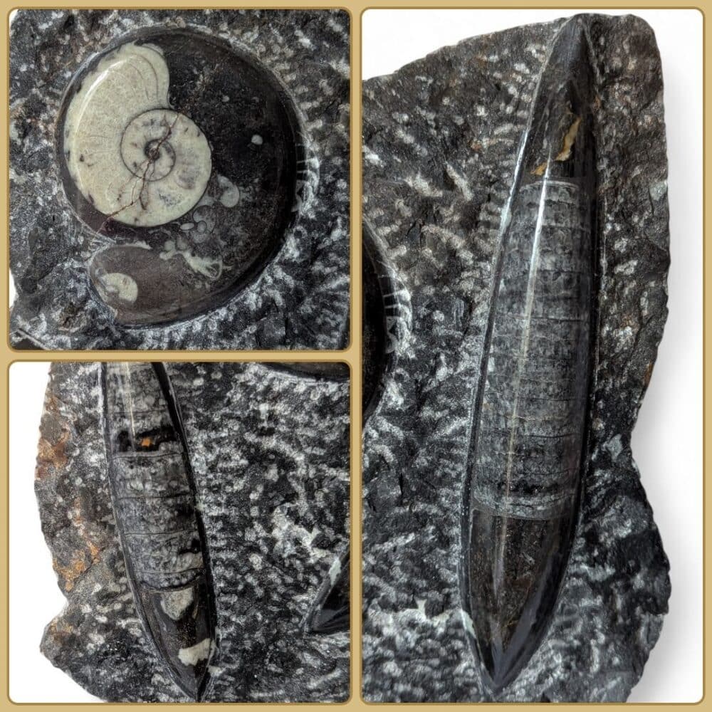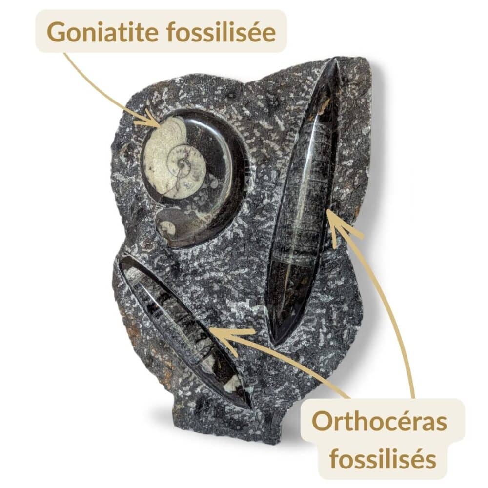 Les Orthoceras sont d’anciens céphalopodes marins à coquille droite, longue et conique. La Goniatite, apparue il y a environ 390 millions d’années, est un ancêtre des ammonites, reconnaissable à sa coquille en spirale. À l’origine, ces coquilles reposaient au fond des mers. Des sédiments les ont progressivement recouvertes. Avec le temps et la pression, elles se sont minéralisées et sont devenues des fossiles naturels marins.