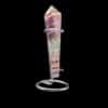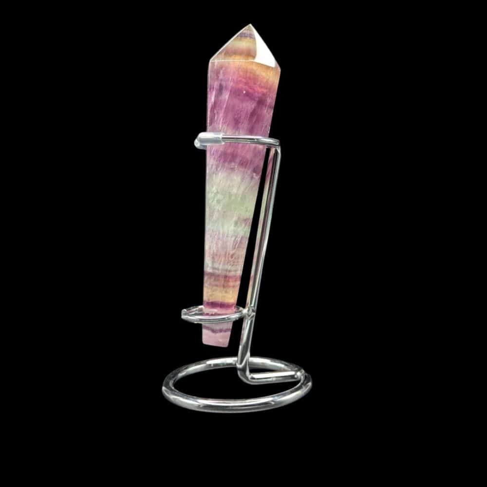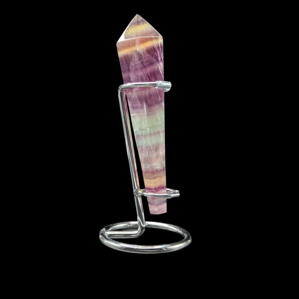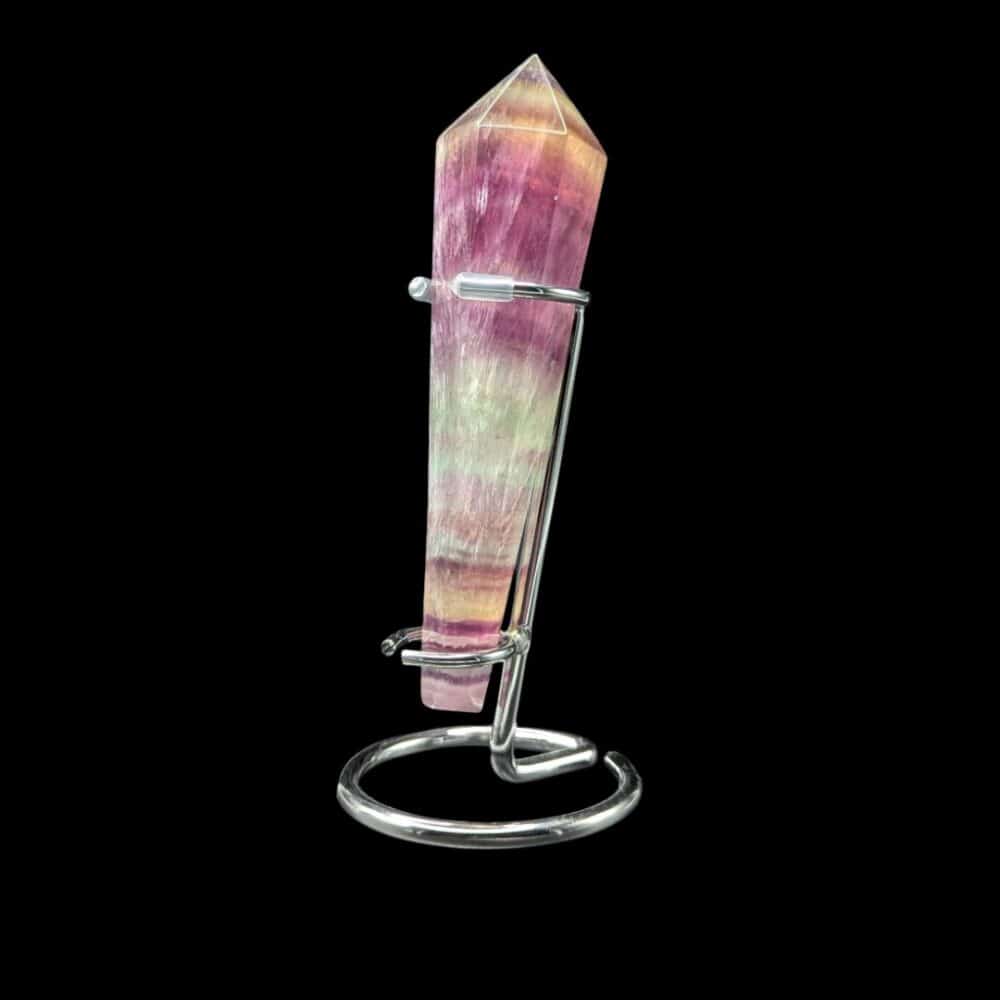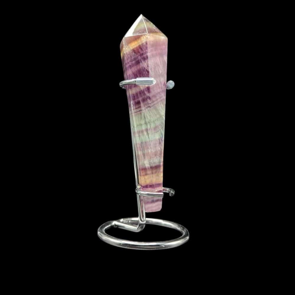 Posée sur son socle, cette pointe de Fluorite Rainbow (multicolore) révèle toute sa splendeur.