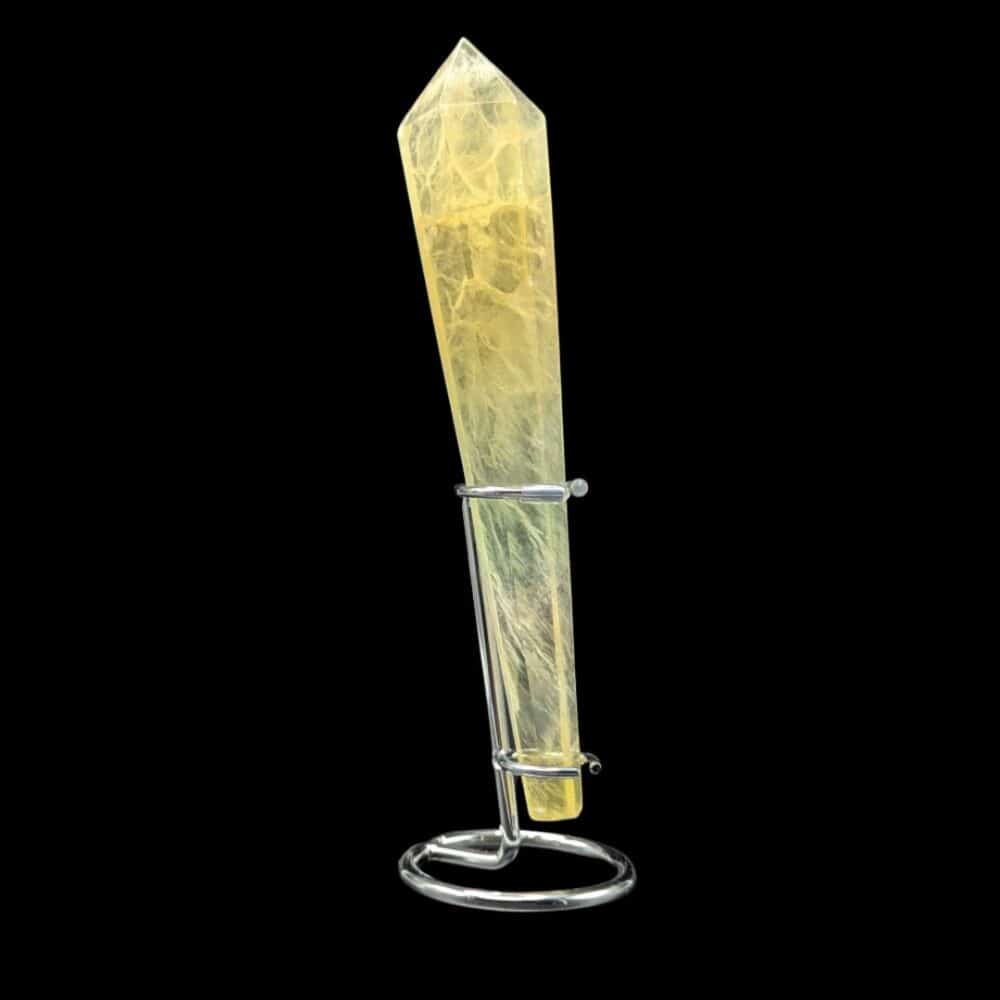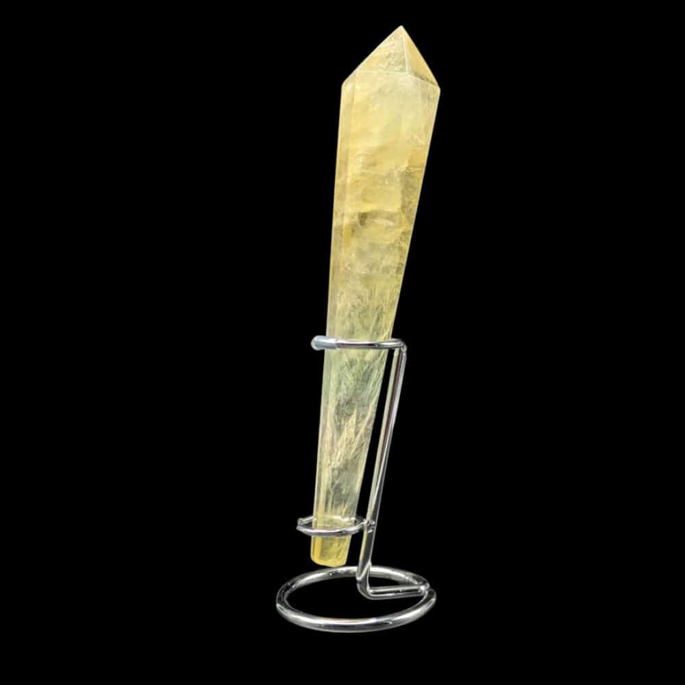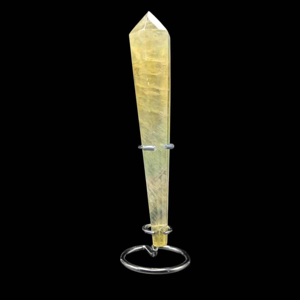 Posée sur son socle, cette pointe de Fluorite Rainbow à dominante jaune dévoile toute sa splendeur.