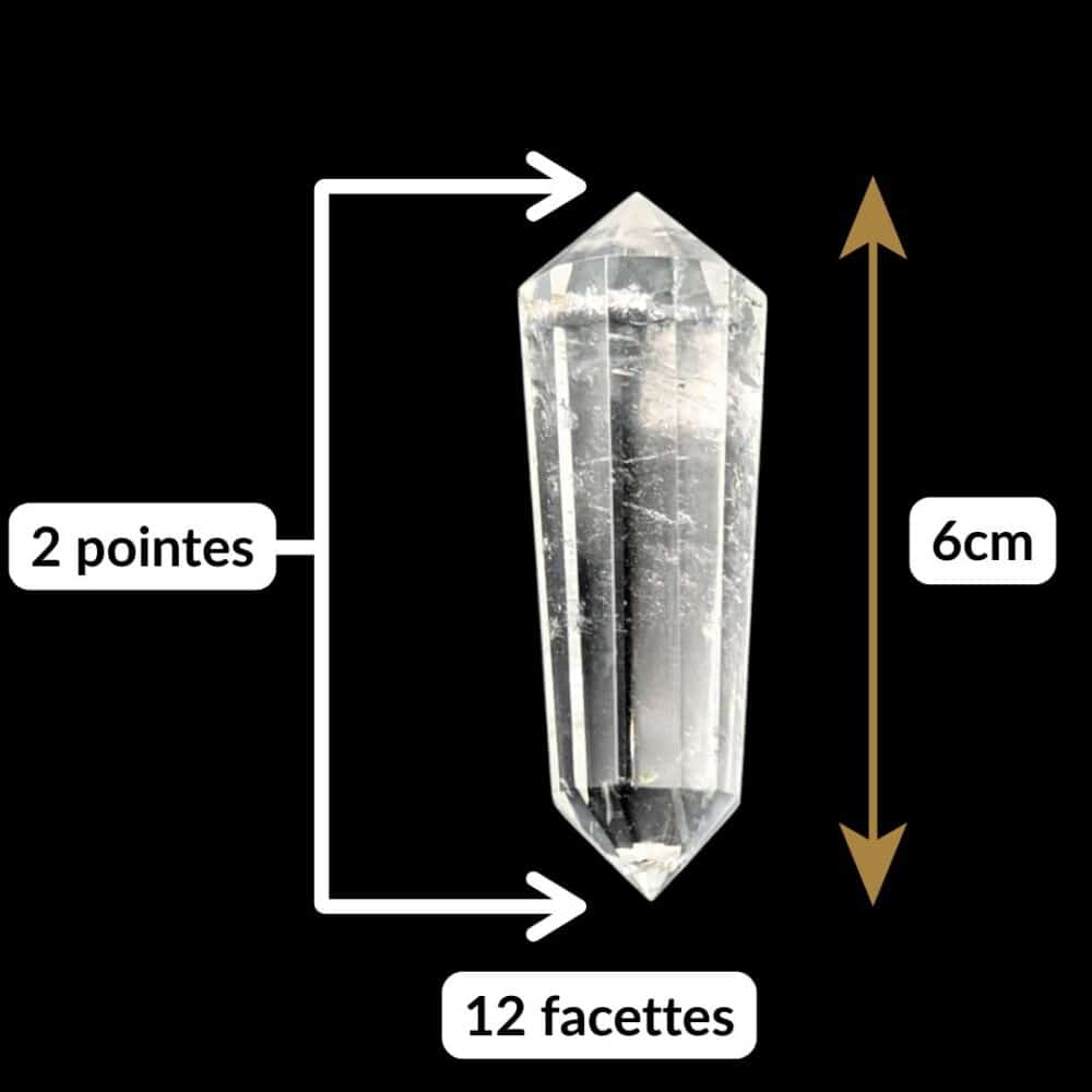 • Forme spécifique : Il est taillé en double pointe, avec des angles et proportions calculés selon la géométrie sacrée. Une pointe (réceptrice) capte l’énergie, l’autre (émettrice) la dirige.
